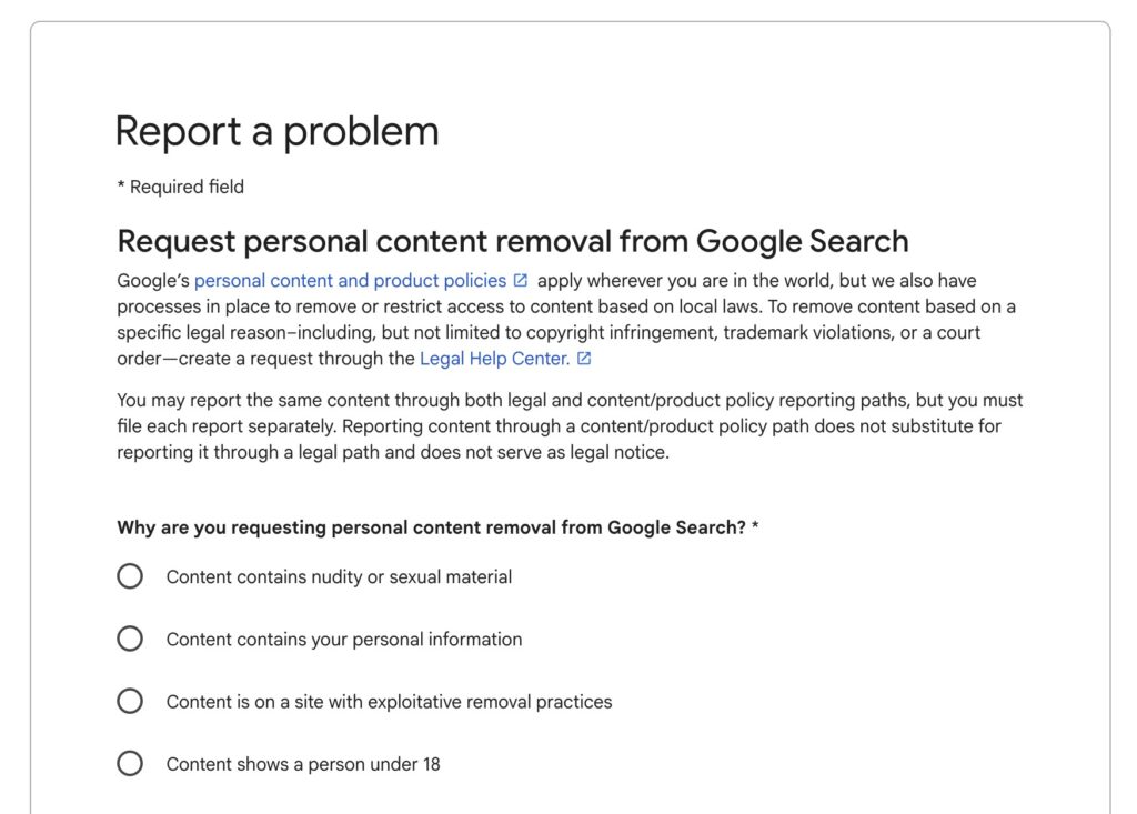 - For search engines like Google, use the Non-consensual intimate imagery removal form.